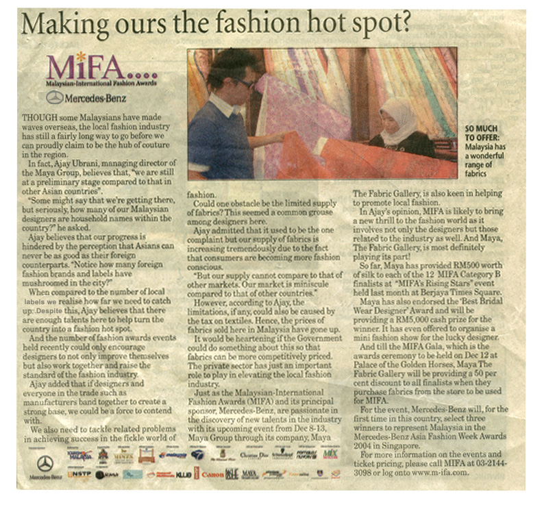 Just as the Malaysian-International Fashion Awards (MIFA) and its principal sponsor, Mercedes-Benz, are passionate in the discovery of new talents in the industry with its upcoming event from Dec 8-13, Maya Group through its company, Maya, The Fabric Gallery, is also keen in helping to promote local fashion.