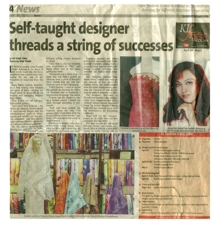Maya will try her mix-and match art in bridal wear for this coming KL Fashion week.This time around, she will blend Chinese, Malay and Indian elements, such as pairing a saree with kebaya or using Chinese silk to make Indian bridalwear.